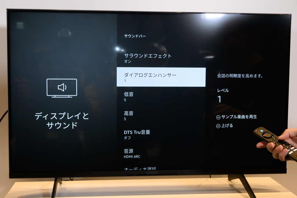また、特にFire TVデバイスと同時使用する際のセットアップの簡素さも強調された。Soundbar Plus本体に搭載される端子は、電源ジャック/eARC対応HDMIポート/光デジタル出力/USBポートのみ。Fire TVと同じテレビに接続すると、互いを自動的に認識し、Fire TVのUIにサウンドバー用設定メニューが出現。操作もFire TVのリモコンから行うことができる。本機を光デジタル接続する場合でも、追加の操作は必要だがFire TVを認識するよう設計しているとのことだ。Fire TVを組み合わせずとも、付属リモコンと音声ガイダンスで分かりやすく操作できるよう配慮している。