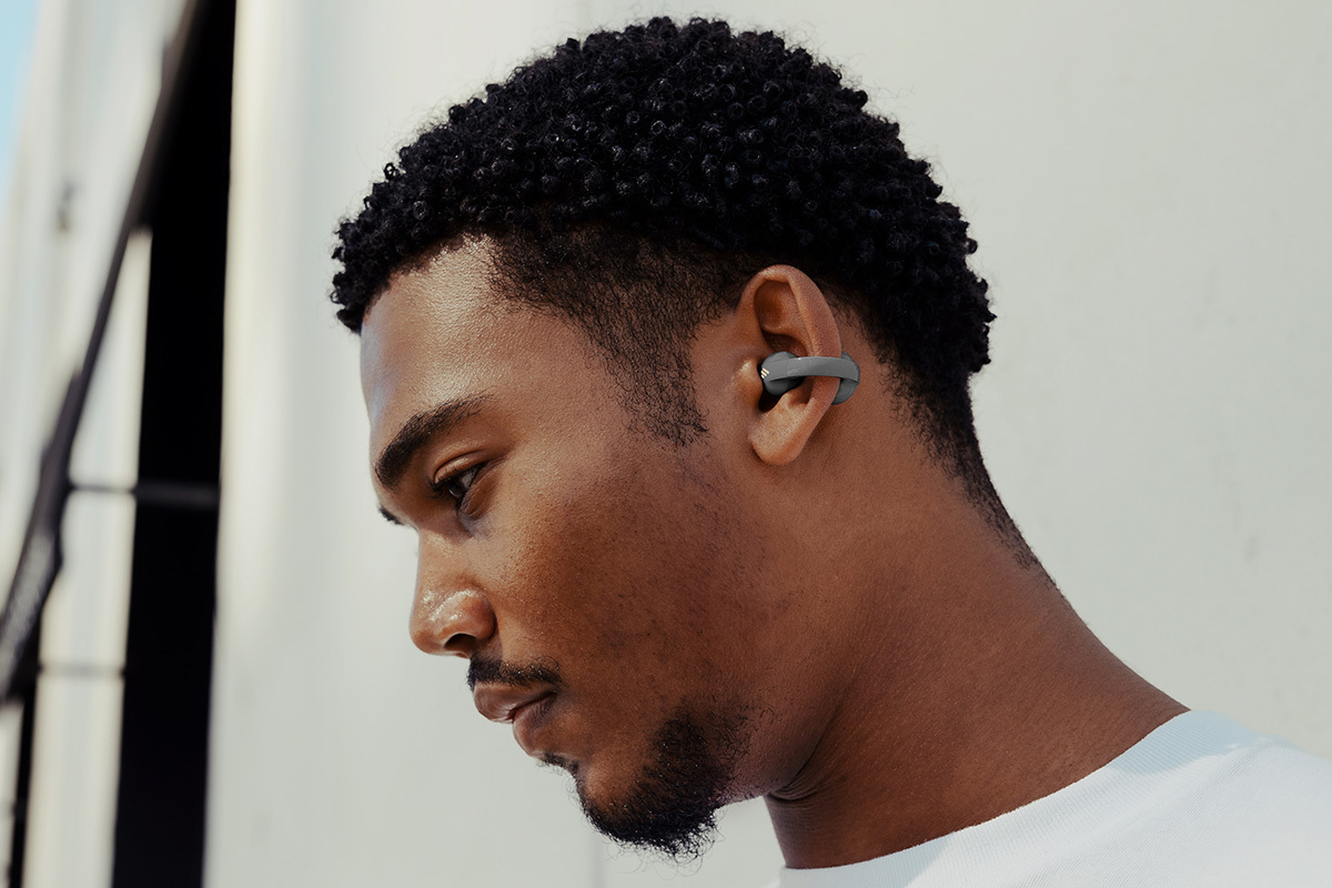 耳の縁を挟み込むように装着するクリップ型の完全ワイヤレスイヤホン。耳穴をふさがないオープン構造らしい軽快感とアクセサリーのような外観を両立させたと同社はアピールしている。適度な挟み込みを実現する形状記憶合金製ワイヤーと、肌に優しいシリコン製表面素材を採用することで、長時間の装着にも配慮したとする。