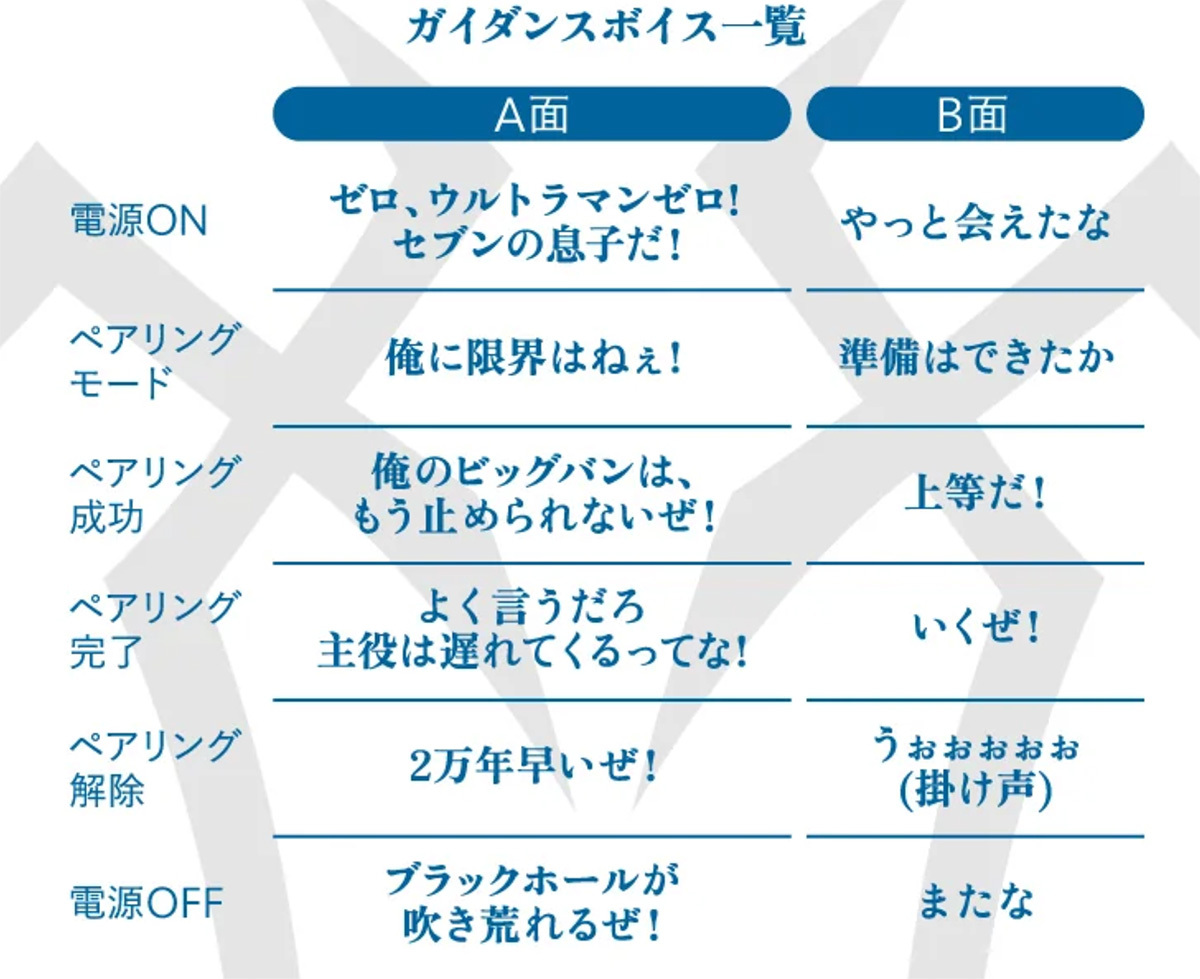 ガイダンス音声は「2万年早いぜ!」など、ウルトラマンゼロの名台詞を収録したA面と、本モデルでしか聴けないウルトラマンゼロ(CV:宮野真守)の録り下ろし音声のB面の2パターンを用意。B面ではまるでウルトラマンゼロと一体化し、インナースペースでウルトラマンゼロが語りかけるような気分を味わえるとしている。