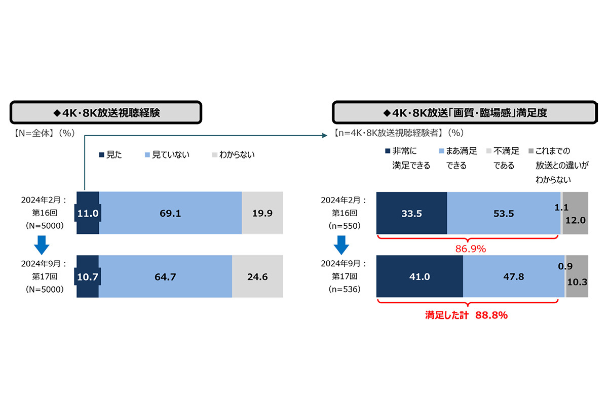 4K・8K衛星放送に対する認知度については、2023年2月に実施された前回調査と大きな差は見られなかった。視聴経験・満足度も同様で、視聴経験者の「画質・臨場感」の満足度は9割弱と高水準をキープしている。