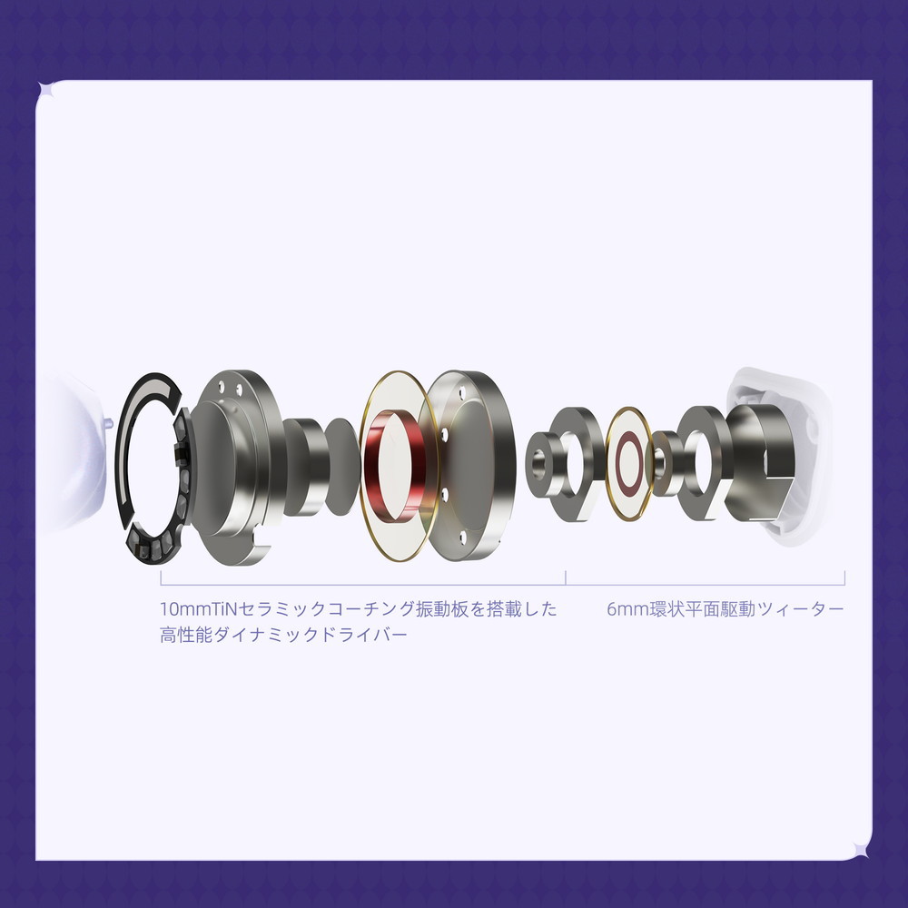ドライバーユニットは、10mmダイナミックドライバーと、6mmの環状平面駆動トゥイーターを同軸配置したハイブリッド構成を採用する。ダイナミックドライバーはTiNセラミックコーティング振動板、軽量なCCAWボイスコイル、強力なN52ネオジウム磁石を備え、さらに平面駆動トゥイーターがクリアな高域を補完。加えて、フロントキャビティには同ブランドのモニターイヤホンから受け継いだエラストマーダンパーを内蔵し、音響調整を行った。これにより、“細かなディテールも見逃さず、力強く豊かな音色を実現する” としている。
