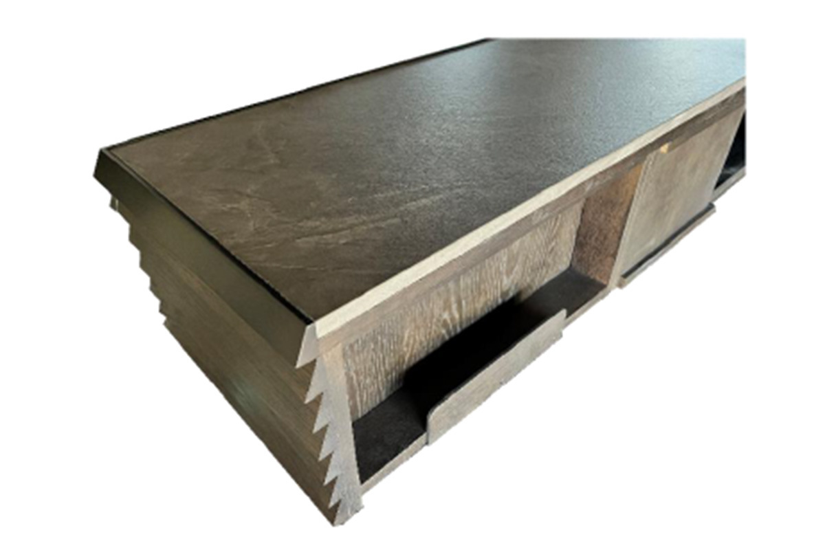 天面は優れた表面硬度を成し得る大理石調メラミン樹脂板を採用することで、耐荷重110kgを実現。正面からサイドに回り込むデザインによって「単独で設置されることの多いテレビボードに高級感を与える」とアピールするほか、高級家具に使用されるソフトクローズ引き出し、ソフトダウンステー扉が搭載されている。背面にはACテーブルタップやHDDを収納できるスペースも装備。