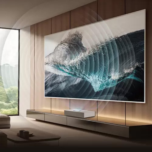 LIBERTY WIDE PROは、韓国のスクリーンブランド「Bloomsbury.lab(ブルームズベリー ラボ)」が手掛けるプロジェクター専用スクリーン。大きな特徴として、内部に搭載したアクチュエーターにより、スクリーン自体を振動させて音を発生させる「シネマティック・サウンド・オプティカル・ディスプレイ」技術を搭載している。AVアンプとの組み合わせによりフロント3ch(センター/ライト/レフト)の音声を鳴らせるため、前面はスクリーンのみというシンプルなホームシアターを構築することができる。