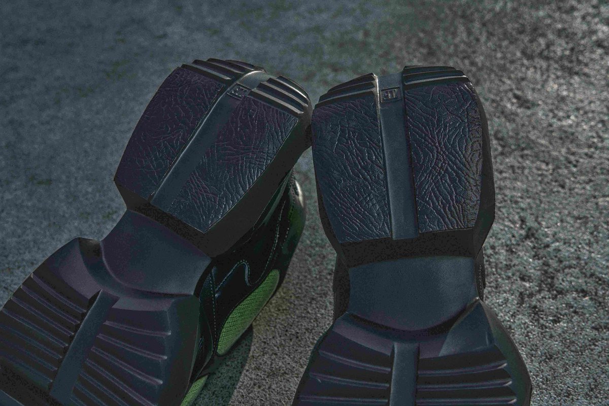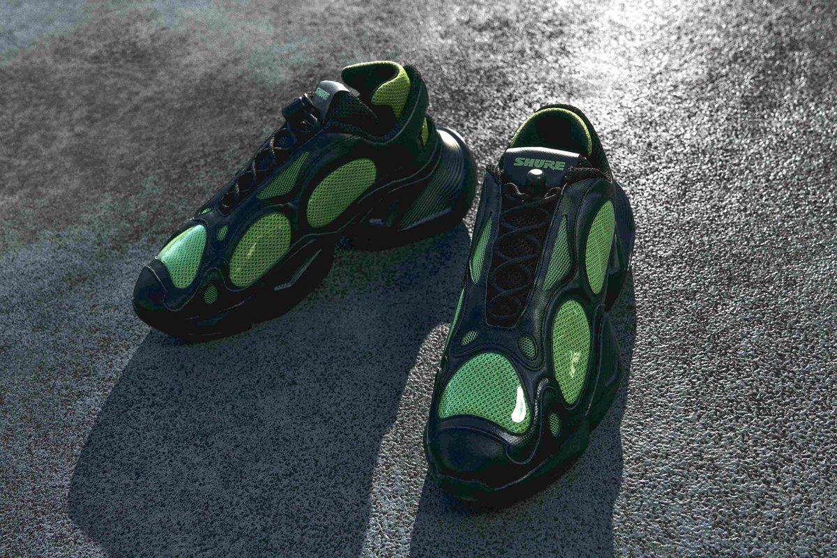 デザイン/設計/制作を手掛けたのは、シューズアーティストの戸田健太氏。シューズのアッパーはShureのブランドカラーである「イグニッショングリーン」とブラックで構成されており、メッシュファブリックをカバーするエナメルウィンドを採用している。
