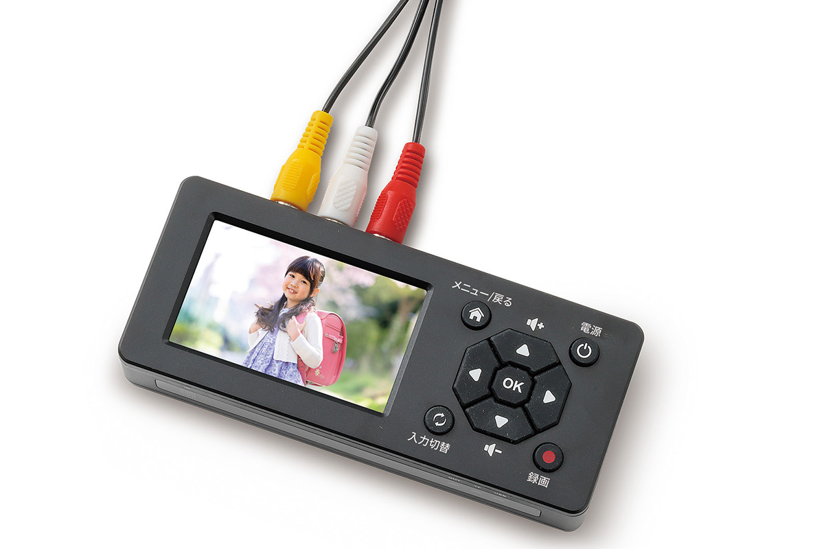 「思い出ビデオ変換レコーダー」はパソコンを必要とせず、ビデオデッキやビデオカメラとケーブル接続するだけで、VHS、8mm、miniDなどのアナログ映像を直接デジタル化できるビデオキャプチャーデバイス。デジタル化されたデータはUSBメモリや、micro SDカード(ともに512GBまで)内に保存することができる。