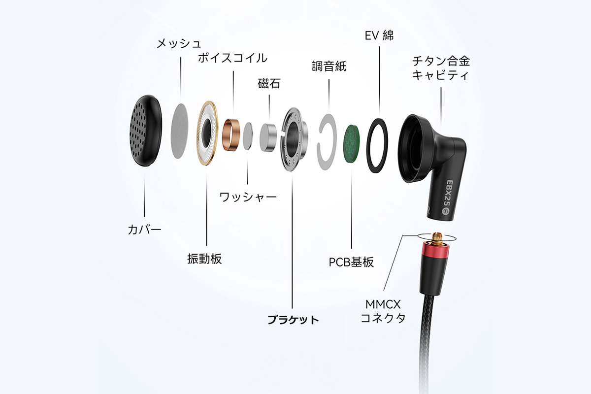 EBX25Tiは、同ブランドのダイナミックドライバー搭載インナーイヤー型イヤホン “EBシリーズ” の新フラグシップモデル。ダイナミックドライバーは14.2mm径のドーム型ベリリウムメッキ振動板を搭載する。自然な音場で分離感が高く、全体的にバランスのとれたクリアサウンドを実現したといい、とくに高域は刺さりが少なく透明感の高い音質で、華やかかつ明瞭な余韻を表現するとアピールする。