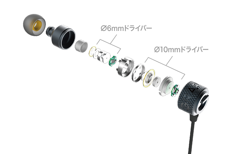 低音域用にポリウレタン+LCP液晶ポリマー振動板の10mm径ダイナミックドライバー、高音域用にポリウレタン+PEEK 振動板の6mm径ダイナミックドライバーを備え、ゲーム内で重要な効果音を明瞭に響かせるとアピール。また、この2基のダイナミックドライバーを同軸上に配置した構造により、歪まない低音域と明瞭な中高音域を実現したという。