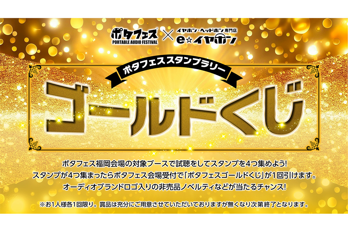 また、当日は抽選で豪華製品が当たるスタンプラリーも実施する。会場の対象ブースで「試聴」をしてスタンプを4つ集めると「ポタフェスゴールドくじ」を1回引くことができ、当選者にはブランドロゴ入りの非売品ノベルティなどがプレゼントされる。
