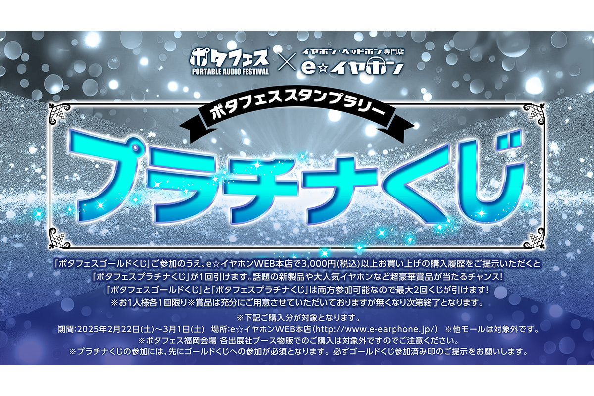 さらに、ポタフェスゴールドくじ参加のうえ、e☆イヤホンWEB本店で税込3,000円以上の買い物をして、購入履歴を提示すると「ポタフェスプラチナくじ」1回に参加可能。抽選で話題の新製品や大人気イヤホンなどが当たる。