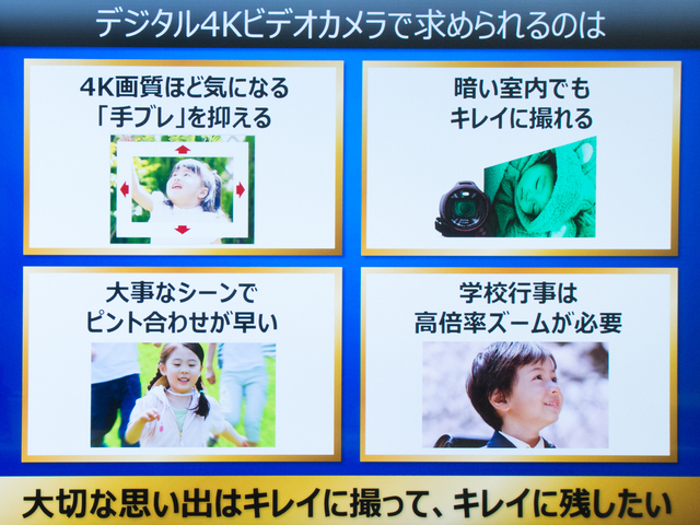 4Kテレビの出荷台数が増加し、各家庭の視聴環境が大画面化する中生まれた「記録も高画質で行いたい」というニーズに応えた新モデル。「HC-WXF1M」はモニター部のサブカメラ、ファインダーを備えた最上位モデル、「HC-WX1M」はファインダーを省いたレギュラーモデル、「HC-VX1M」はサブカメラやマニュアルリングを省いたスタンダードモデル、「HC-VX990M」は4Kを簡単に撮影できる機能をフィーチャーしたエントリーモデルとなる。