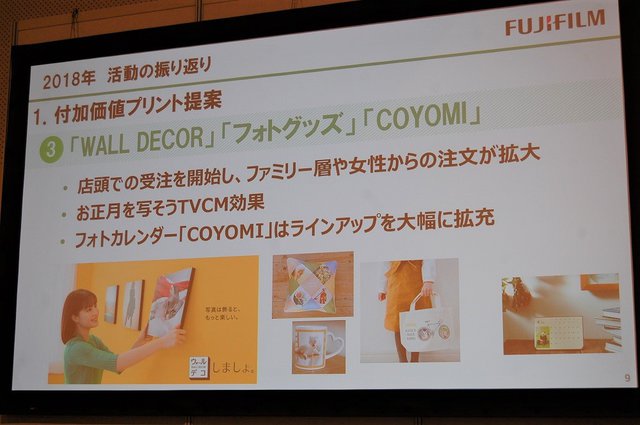 フォトイメージング事業では4つの重点課題を掲げた。1つ目の重点課題は「スマホユーザーの被写体別・シーン別の撮影・プリント実態をベースにした付加価値プリント商材の提案」。年賀ポストカードでは、お家インクジェットユーザーからの置き換えをターゲットに、「作り分け応援サービス」「宛名印刷サービス」「住所録保管サービス」を展開し、年賀はがきが10円値上げとなり、発行枚数も減少する中で、「写真業界の窓口では銀塩・印刷を合計するとほぼ前年並みの数量を確保できた」と健闘を見せた。