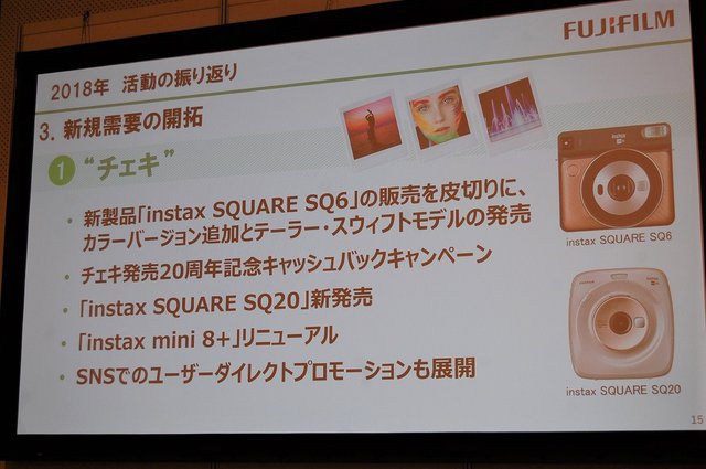 3つ目の重要課題は「チェキスクエアタイプのラインナップ強化による新規需要の開拓」。昨年5月に新製品「instax SQUARE SQ6」を発売。スクエアタイプの魅力訴求で、新規需要創造を推進した。11月からは、チェキ発売20周年を記念した新製品投入やキャンペーンを展開。SNSによるユーザーダイレクトプロモーションにも注力し、新規需要創造を推進する。