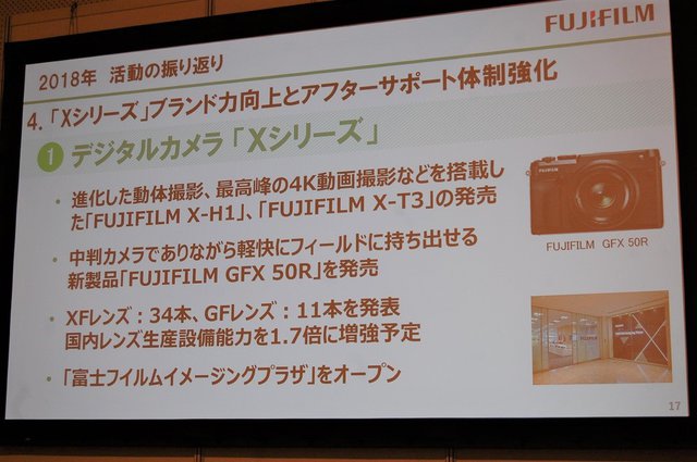 そして4つ目が「Xミラーレスカメラのユーザーダイレクト訴求によるブランド力向上とアフターサポートの体制強化」。Xシリーズでは「X-H1」「X-T100」「X-T3」の新製品を発売。GFXシリーズは、9月のフォトキナで中判カメラでありながら軽快にフィールドに持ち出せる新製品「GFX 50R」を発表。さらに、1億画素モデルの開発を宣言した。レンズはXFレンズ34本、GFレンズ11本を揃え、「2020年までに国内レンズ生産設備能力を1.7倍に増強する」と力を込めた。