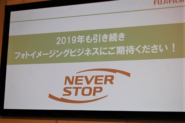 「富士フイルムグループは、立ち止まらずに挑戦し続ける企業であることをお伝えするために、 “NEVER STOP” をメインメッセージとして掲げている。弊社も需要を創造し続けるため、2019年はユーザーとの共感と信頼を構築し、憧れを提案・提供することで、ユーザーの “もっと楽しい!” を実現し、イメージングビジネスの拡大を目指す。今回のフォトイメージングフェアはその序章」と語る西村社長。フェア開催を皮切りに、全力で市場を一段高みに引き上げていく。
