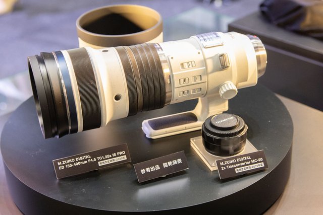 また参考出展として、2020年発売予定の望遠ズームレンズ「M.Zuiko Digital ED 150-400mm F4.5 TC 1.25x IS PRO」と、2019年9月発売予定のテレコンバーター「M.Zuiko Digital 2x Teleconverter MC-20」が展示。特に望遠ズームレンズの方は試作段階となっており、ここから見た目など変わる可能性もあるという。