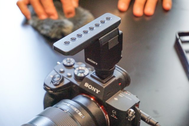 さらに本機では、動画撮影時の音にも注目。従来はホットシュー(マルチインファーフェースシュー)で接続するアクセサリーのマイクで録音した音声は、アナログ信号で本体へ転送していた。しかし本機では音声のデジタル接続に新対応させることで、ノイズの少ない録音が可能になったという。デジタル伝送にはマイク側も対応する必要があるが、この対応マイク「ECM-B1M」も同時発表。こちらについては後述する。