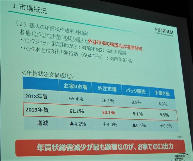 富士フイルムの2019年賀状に見られる傾向では、年々利用率が高まるスマートフォンからの注文がほぼ半数にまで拡大した。店頭機では前年46.3%から52.6%へ、ネットでは同43.5%から46.7%に構成比が高まった。注文時期からは「喪中はがき印刷の早期受注獲得、そして、さらに後半化する年末の駆け込み、この二大需要の取り込みが大きなテーマになる」と説明した。