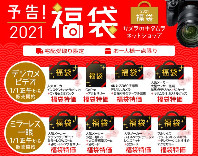 現在、キタムラネットショップでは、「2021 年 福袋セール」の予告動画を公開している。なお、購入した商品は宅配での受取り限定、お一人様一点限りとなる。