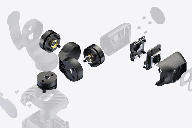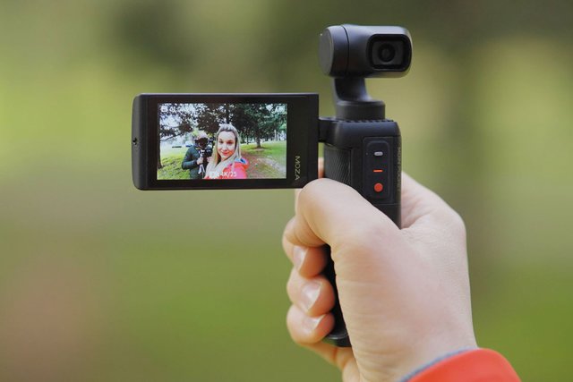手のひらサイズに3軸手ブレ補正と2.45インチのモニターを搭載したジンバルカメラ。レンズは120度(焦点距離14mm)の超広角となり、絞りはF2.2。1/2.3インチのCMOSセンサーを採用し、最大4K/60pの動画収録と1,200画素の静止画撮影が行える。ISO感度は100 - 3200。