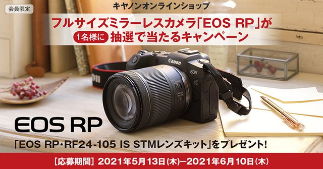 キャンペーン期間は6月10日(木)まで。直販サイトで行っているアンケートに回答すると、抽選で1名に「EOS RP・RF24-105 IS STMレンズキット」が当たる。