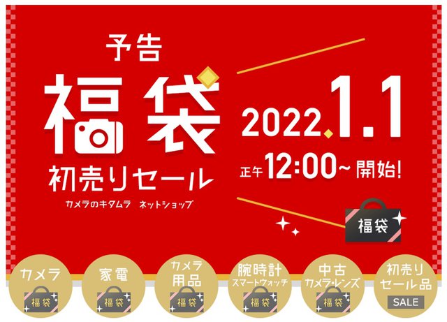 カメラのキタムラ ネットショップでは、年始恒例となった「福袋 初売りセール」を2022年1月1日(土)正午12時よりスタート、1月3日(月)朝9:00まで開催する。カメラはもちろん、家電、カメラ用品、腕時計・スマートウォッチ、中古カメラ・レンズの福袋が用意される。お得な初売りセール品も数多く品揃えする。