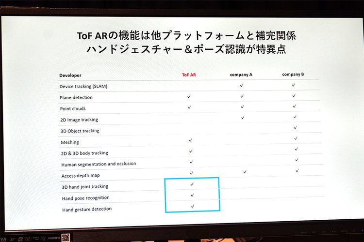 ToF ARはiOS/Android両対応で、開発ツールはUnityを用いる。なお、米国IT企業が提供するARプラットフォームと補完関係にあるとしており、ToF ARでは上述のセンサーによる測距情報に基づいた、高精度な手指の認識、ハンドジェスチャーの認識が、他にはない大きな特徴だという。