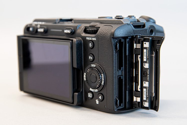 インターフェイスには、ヘッドホン端子として3.5mmステレオピンジャック、USB Type-C、16ビットRAW出力にも対応したHDMI Type-Aを1系統ずつ備える。記録スロットはCFexpress Type AカードとSDカードの両方に対応したデュアルスロットとなる。