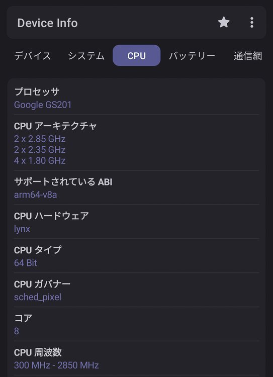 実際にベンチマークソフトを使って計測してみたかったが、Google Playからダウンロードできる信頼がおけるアプリのほとんどは、Pixel 7aにはまだインストールができなかった。そこで、プロセッサーの構成やステータスだけを比較したが、確かに使っているのはGoogle Tensor G2で、CPUのコア数も動作クロック周波数も、Pixel 7や7 Proとまったく同じだった。