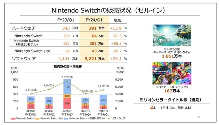 Nintendo Switch関連では、本体の販売台数が前年同期比13.9%増の391万台で、ソフトウェアの販売本数は前年同期比26.1%増の5,221万本。『ゼルダの伝説ティアーズオブザキングダム』が1,851万本の販売を記録したことにより、ソフトウェア販売本数が大きく増加しただけでなく、ハードウェアの販売へのけん引効果も見られたという。