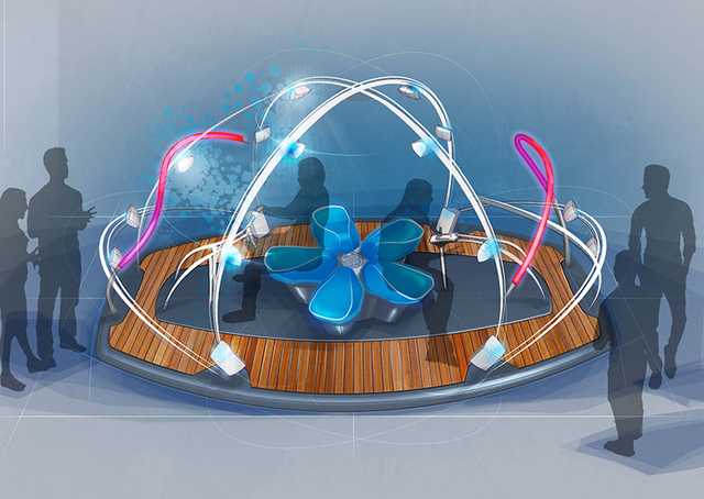 モビリティを操作する所作で音楽を変化させ、音場を動かすことができるというもので、空間内の鑑賞者に対して“音による未体験の移動感覚”を提供するという。無限に繋がっていくようなループ状の造形で構成され、“楽しさが外に向かうようなシートレイアウト”が特徴のデザインとしている。