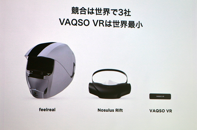 「2016年は『VR元年』と言われたが、何かが足りないと思っていた。それが『嗅覚』。匂いは体験をより深めてくれるもの」と語るのは、VAQSOのスペシャルアドバイザーを務める黒川文雄氏。VR向けの匂い発生デバイスは他社からも既に出ているが、「Noculus Rift」は1種類の香りしか出せず、「feelreal」は複数対応だが大きすぎると分析。コンパクトかつ複数の匂いに対応するZaaZ VR(仮)の優位性をアピールした。