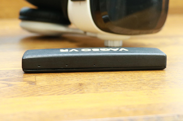「ZaaZ VR(仮)」はお菓子の“スニッカーズ”とほぼ同じサイズと非常にコンパクト。PS VRやOculus lift、HTC VIVEといったVRヘッドマウントディスプレイに取り付けた専用アダプターに、マグネットで装着するかたちをとる。VRヘッドマウントディスプレイとの通信はBluetoothで行う。