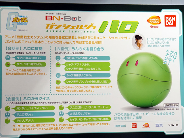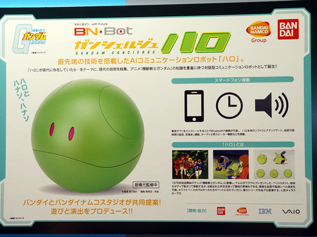 “BN・Bot PROJECT”は、バンダイナムコグループ各社の技術・知識の活用や、他企業との協業などにより、ロボットをはじめとしたIoTサービスを提供するグループ横断の取り組み。本製品では、同社と(株)バンダイナムコスタジオの共同で遊び方や演出を企画。また、『機動戦士ガンダム』の内容に特化した会話AI開発を日本アイ・ビー・エム(株)、ハロ本体の機構や回路設計及び生産をVAIO(株)と協業している。