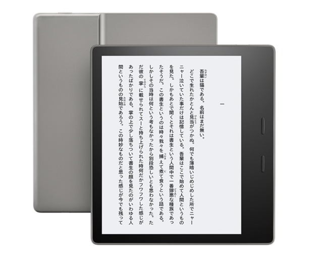 なお、本体のもっとも薄い箇所は3.4mm。筐体はKindle史上もっとも強いというカバーガラスと、対摩耗加工されたアルミの軽量フレームを用いている。また人間工学に基づいて設計されたグリップを備え、片手でも持ちやすい重心バランスとなっている。