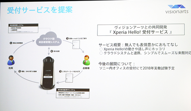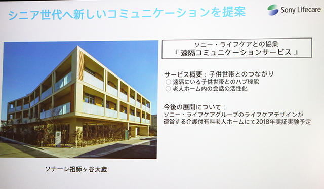 第一段階としては「まずコンシューマー向け製品として家庭内でのコミュニケーションロボットの地位を確立したい」とし、次の段階では様々な技術・機能を使ったBtoBビジネスへの展開も検討しているとのこと。具体的にはオフィスの受付サービスの提案や、シニア世代への新たなコミュニケーション提案として老人ホームと提携した遠隔コミュニケーションサービスなどを企画。2018年からソニーグループ内にて実証実験を開始していくという。