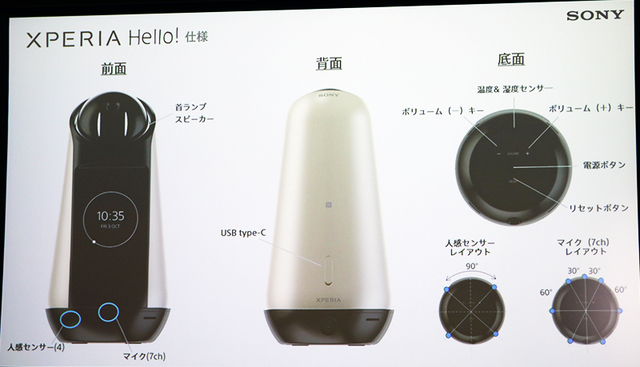 本機はソニーが有するロボティクス技術を、センサーと連動して対話機能を実現する「ソニーエージェントテクノロジー」と組み合わせることで、能動的に周囲の状況を認識して自ら会話するコミュニケーションロボット。同社では「Xperia Hello! は、あたかも“家族の一員”のように、家庭内での会話を促したり、家族を見守る安心感や生活情報を提供するなど、日々の暮らしをアシストする」としている。