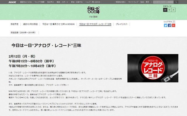 「今日は一日“アナログ・レコード”三昧」が2月12日(月・祝)にオンエア