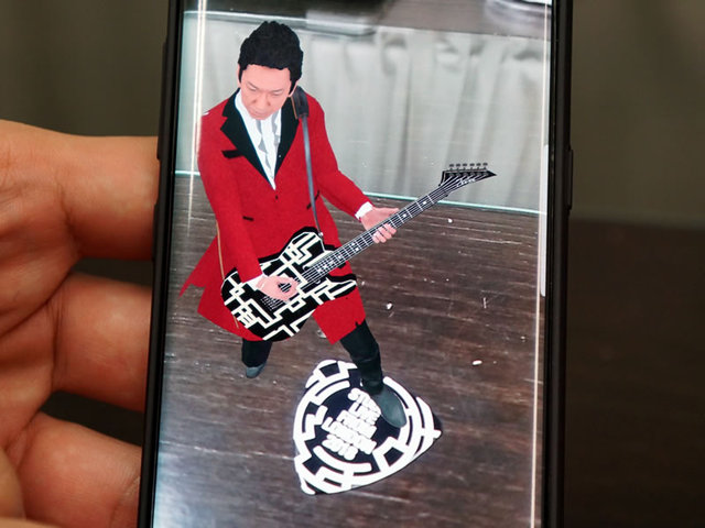 “バーチャル3Dフィギュア” では、オリジナルのピック型ARマーカーにスマートフォンをかざすと、布袋寅泰がバーチャル3Dフィギュアになって画面内に出現。映画『キル・ビル』のテーマ曲「Battle Without Honor or Humanity」のギタープレイを、好きな角度から自由に見ることができる。