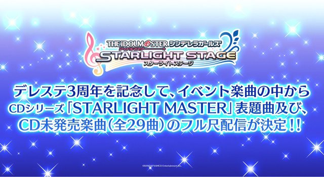 日本コロムビアは、『アイドルマスター シンデレラガールズ スターライトステージ』の3周年を記念して、イベント楽曲の中からCDシリーズ「STARLIGHT MASTER」表題曲および、CD未発売楽曲を含む全29曲のフル尺配信の決定を発表した。