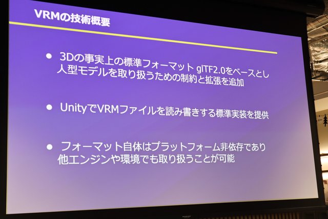 VRMの開発者である(株)バーチャルキャスト 取締役CTO 岩城進之介氏は技術的な仕様について解説を実施。同氏によるとVRMは、Windowsでも標準でも開けるような3D形式「glTF2.0」を発展させることで、3Dアバターとしての使用に適した形式にしたものだという。