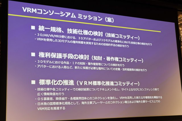 具体的な活動内容はまだ確定していないとのことだが、発表会では団体が担うミッション案が3つ挙げられた。1つめは「統一規格、技術仕様の検討」。これは3Dアバター・モデルなどの標準化に向けた技術仕様の検討を行うほか、VRMを使用した3Dモデルの権利保護を実現するための技術的手法の検討を行うというもの。