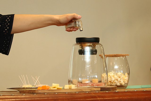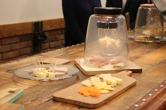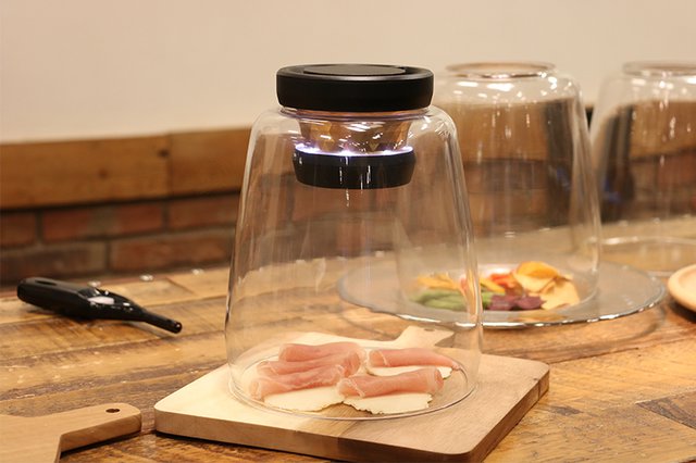 本体の上蓋を外し、底面にある電源ボタンを押して電源がONになると、LEDが点灯してファンが回り始める。その状態でガラスドームの上にセットし、中央部にあるウッドトレイにキューブ状のスモークウッド「Smoke CUBE」を入れ、点火して煙が出始めたら上蓋を閉めると、3、4分で煙が下に落ちてくる。燻製自体は約5分から10分程度で完成するという。