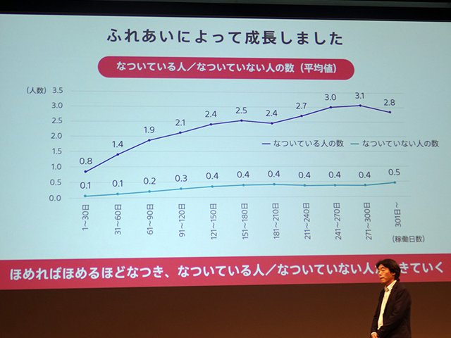 発表会で登壇したソニーの川西氏は、aiboはオーナーと一緒に生活していくことでAI学習によって個体ごとの性格に差が現れることを改めて紹介。例えば、より親しい人には決めポーズを多く見せたり、本物の犬のようにオーナー家族のなかでも人を順位付けするなど “十犬十色” の個性を持つように成長すると説明する。