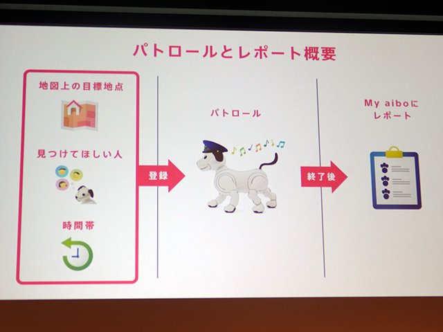 「地図とパトロール」機能では、aiboが作った家の地図の中で、aiboにパトロールしてほしい場所を指定し、名前をつけることができる。そして、予め設定された時間帯になると、aiboは「犬のおまわりさん」のメロディーとともにその場所まで歩いて、「見つけてほしい人」を探し、可愛いふるまいを披露してくれるという。