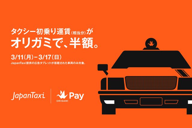 (株)Origamiは、対象加盟店にて同社のスマホ決済サービス「Origami Pay」で支払うと半額になる『オリガミで、半額。』企画の第四弾として、3月11日(月)から3月17日(日)の期間、JapanTaxiのタブレット搭載タクシーにて、初乗り運賃相当分が半額になるキャンペーンを実施する。