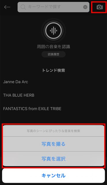 AWAを起動して、「検索」アイコンをクリックすると、右上に「カメラ」アイコンが表示される。すると「写真を撮る」もしくは「写真を選択」することで、「写真のシーンにぴったりな音楽を検索」できるようになる。