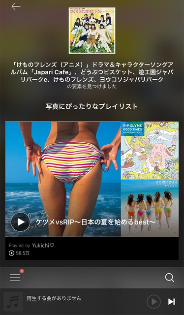 気を良くして、アニメ『けものフレンズ』主題歌「ようこそジャパリパークへ」のジャケットを読ませてみた。要素は「けものフレンズ(アニメ)」や「どうぶつビスケット」などかなり高精度。写真にぴったりなプレイリストとして、「ケツメvsRIP〜日本の夏を始めるbest〜」が表示された。うん?