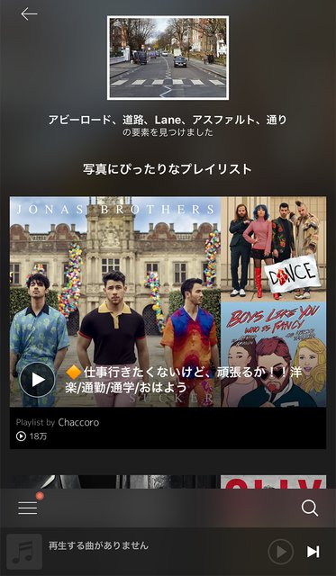 続いて「アビーロード」の写真(Wiki参照)を読み込ませてみる。「アビーロード」「道路」「Lane」「アスファルト」「通り」の要素が挙げられたので、これはビートルズ関連のプレイリストが出るかと思いきや「仕事行きたくないけど、頑張るか!!」というプレイリストがぴったりとオススメされた。アビーロード=仕事行きたくないのロジックに、早々に暗雲が立ち込める。