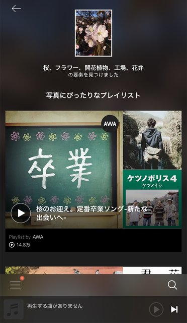 まず季節的に、桜の写真(Wiki参照)を読み込ませてみた。すると「桜」「フラワー」「開花植物」などの要素が検出され、「桜のお出迎え。定番卒業ソング-新たな出会いへ-」や「桜ソング」に「春だ! 桜満開お花見ソングで盛り上がろう!」などのプレイリストが次々出てきた。なるほど、要素から導き出されたプレイリストが表示されるようだ。