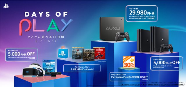 ソニー・インタラクティブエンタテインメント(SIE)は、2019年6月7日(金)〜6月17日(月)まで、期間限定または数量限定の様々なPlayStation商品を揃えたスペシャルセール「Days of Play(デイズ オブ プレイ)」キャンペーンを実施する。